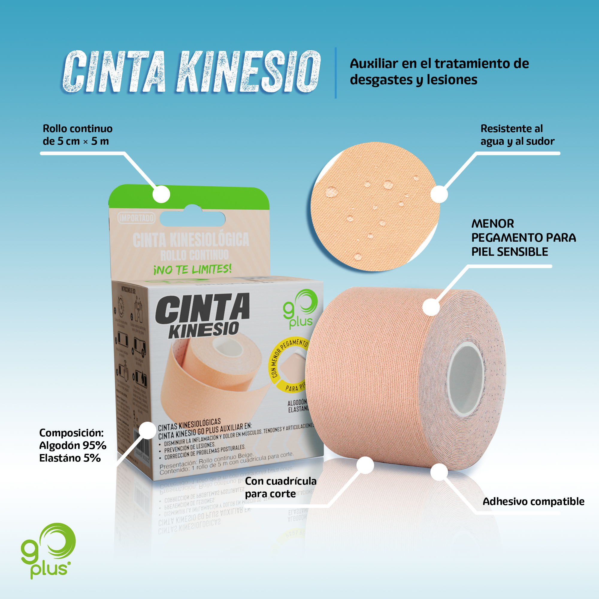 Cinta Kinesiológica Beige Piel Sensible 5m Continua Go Plus