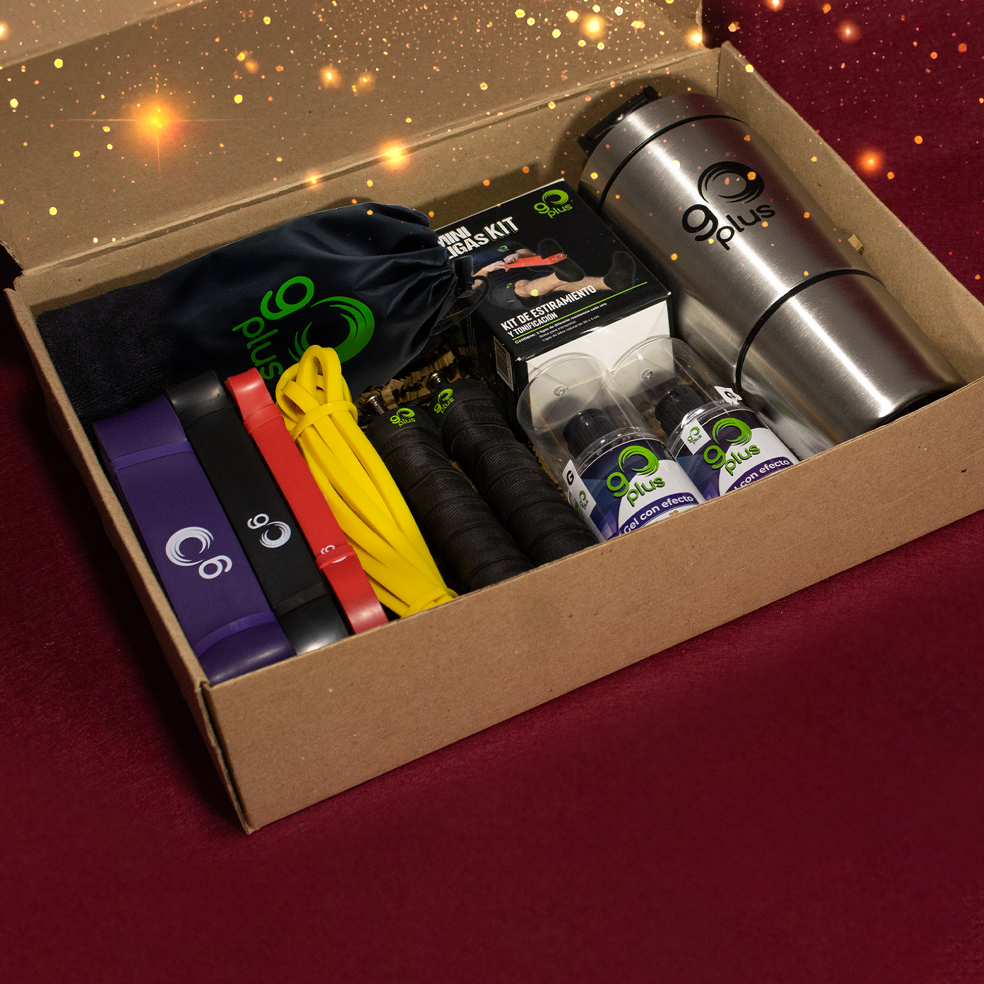 Kit de Regalo Entrenamiento En Casa Go Plus con Bandas de Resistencia, Cuerda para Saltar, Botella Mezcladora Shaker y Gel con efecto frío caliente