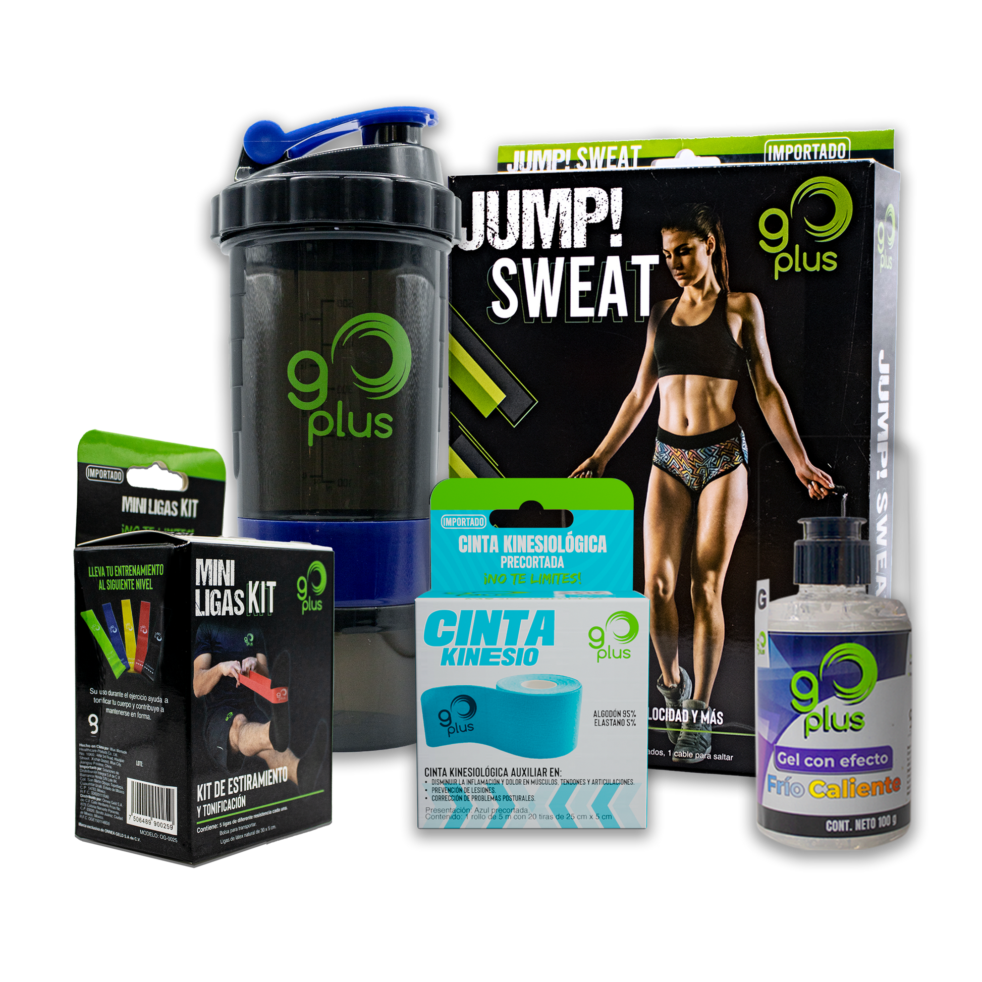 Kit de Regalo Entrenamiento y Ejercicio Go Plus con Cinta Kinesiológica, Ligas de Resistencia, Cuerda para Saltar, Botella Mezcladora Shaker y Gel con efecto frío caliente